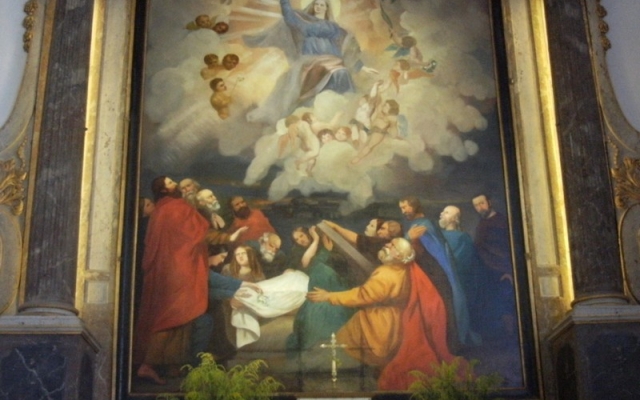 Un magnifique retable représentant l’Assomption de la Vierge orne le mur du chevet. Inscrit à l’inventaire des monuments historiques depuis 1974, ce retable majeur date du 18ème siècle. Il a été restauré en 2012. _ Les retables se développent à partir du Moyen Age en ayant plutôt une dimension décorative liée à la fonction religieuse. _ Le Concile de Trente (1545-1563), au cours duquel l’Église catholique romaine doit répondre à des questions de réforme interne soulevées tant par les protestants que par ses propres membres, encourage la création artistique comme support de dévotion mais également comme outil d’enseignement pour une masse peu instruite. _ Mais c’est au 17ème et 18ème siècle que le retable prend de l’importance, il devient une véritable oeuvre d’art. _ L’art baroque (naissance : fin 16ème s. début 17ème s.) s’est concentré sur les saints, la Vierge Marie et sur des épisodes bien connus de la Bible. Par opposition à la peinture de la Renaissance qui montre habituellement le moment précédant un événement important, les artistes baroques choisissent le point le plus dramatique, le moment où l’action se produit (c’est tout à fait le cas pour notre retable !). L’art baroque est réputé pour évoquer l’émotion et la passion et non la rationalité et le calme qui se dégage de la peinture de la Renaissance. _ _
