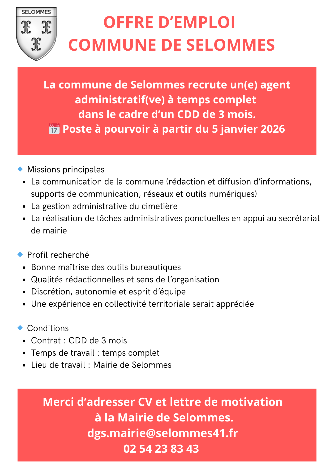Les bureaux de la mairie seront fermés au public les 26 décembre 2025 et 2 janvier 2026.
