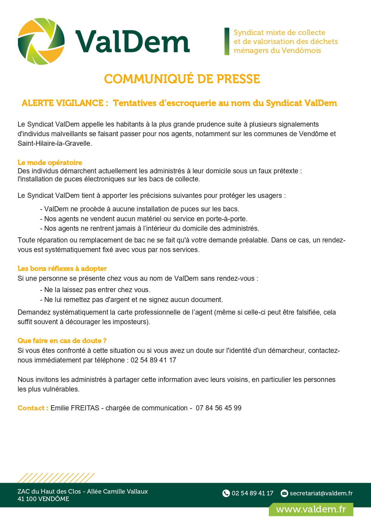 Communiqué de presse Valdem – Tentative d’escroquerie